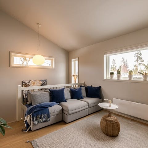 Sofaen er fra nordic nest. Sofaen har et skandinavisk pent utseende med en lys beige farge og ben i lys heltre eik.