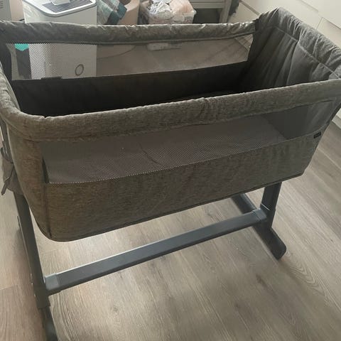 Yngri Tova bedside crib med høydejusterbar funksjon og hjul. Designet for enkel tilpasning ved siden av sengen, egnet for barn.