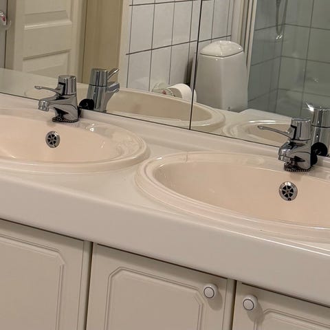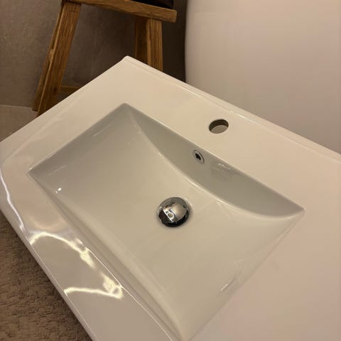 Blandebatteriet har separate håndtak for varmt og kaldt vann, og er designet for enkel bruk og funksjonalitet.