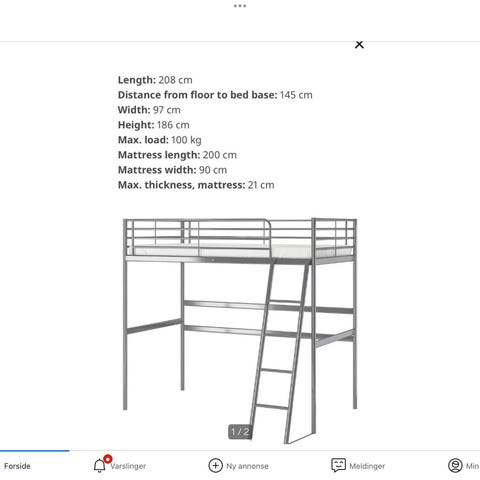 IKEA køyeseng i metall med stige. Sengen har en over- og underkøye, og er laget i grått metall. Passer for barnerom eller gjesterom med behov for plassbesparende soveplass.