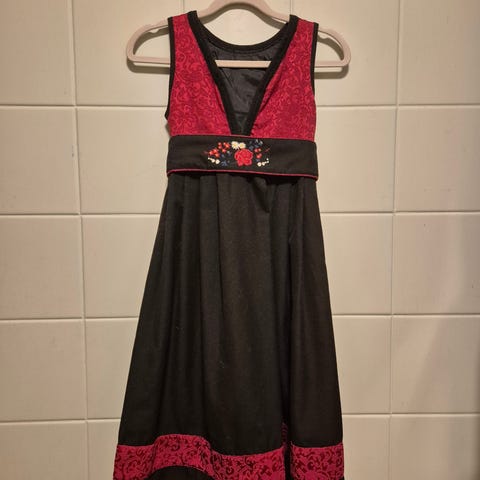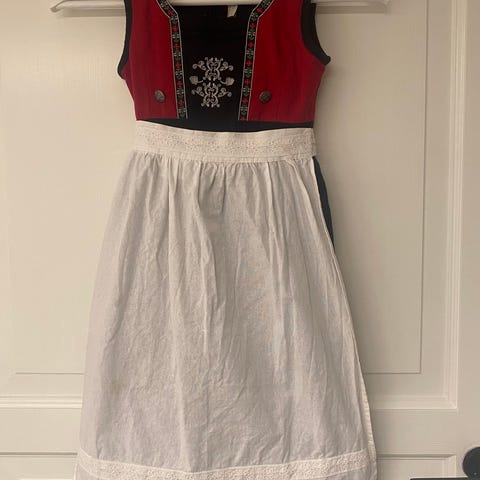 Festdrakt til barn 7-8år(122/128). Forklet har raknet litt i ene enden (se bilde), dette burde være lett å sy med ett par sting. Følger med veske.