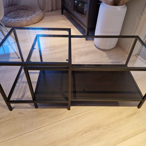 IKEA VITTSJÖ bord med brun/svart glassplate, diameter 75 cm. Bordet har ramme i metall og glassplate, designet for bruk som salongbord eller sidebord i stue eller oppholdsrom. Salongbordet er daglig bruk, det finnes riper i glasset