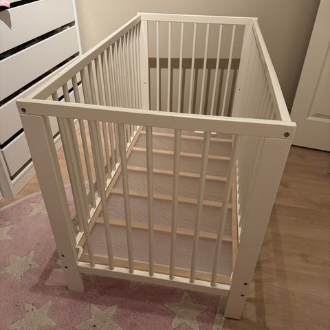 Sprinkelseng 60x120 cm i hvit farge. Sengen heter Gulliver, madrass Kummelur, begge fra IKEA. Trekket til madrassen er renset og vasket. Det er satt på Sleepy Troll bed rocker feet som gjør det mulig å "vugge" sengen hvis behov. 2 mulige innstillinger på sengebunnen.