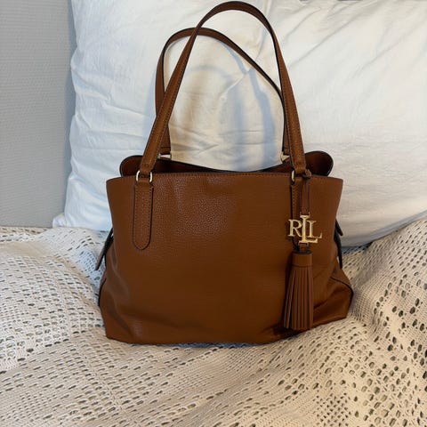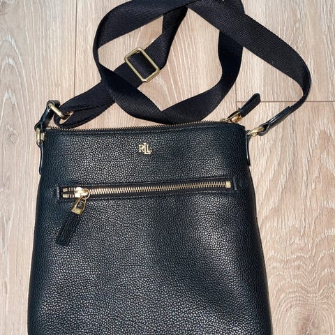 Ralph Lauren skulderveske laget i lær, designet for dame. Vesken har dobbel håndtak og avtagbar skulderrem, med gullfargede metallbeslag. Den har en romslig innside med mange innerlommer og en firkantet form som gir god oppbevaringsplass. God plass til PC, perfekt som jobbveske. Store glidelåslommer på hver langside av vesken.