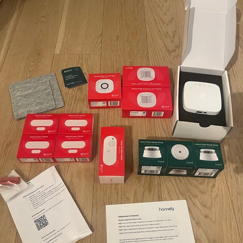Frient Alarm alarmsett som inkluderer alarm motion sensor 2, alarm siren og alarm keypad. Produktene er designet for å sikre hjemmet ved å oppdage bevegelser, avgi alarmsignal og gi kontroll via tastatur. Levert fra Homely