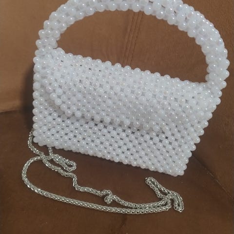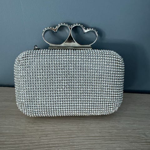 Clutchveske med sølvperler. Pent og lite brukt. 75kr. Kan sende