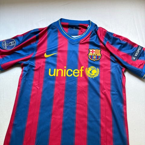 Barcelona Messi Fotballdrakt i blå og rød farge med fine gule detaljer. Størrelse M. Drakten har klubbens emblem og Messi nummer 10 på ryggen. Laget i pustende matieriale. Kjøpt på retrokit.