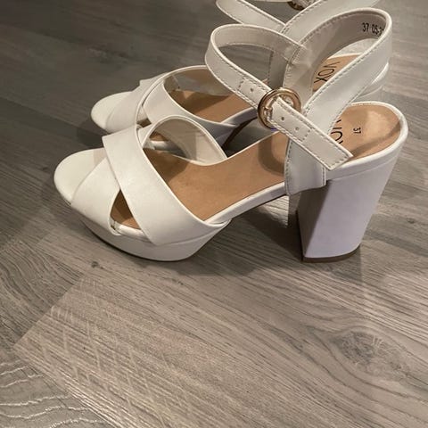 & Other Stories hæler i størrelse 38. Skoene har en åpen tå og ankelstropp med spenne. Fargen er lys, og materialet fremstår som mykt og glatt. Passer til formelle og uformelle anledninger.