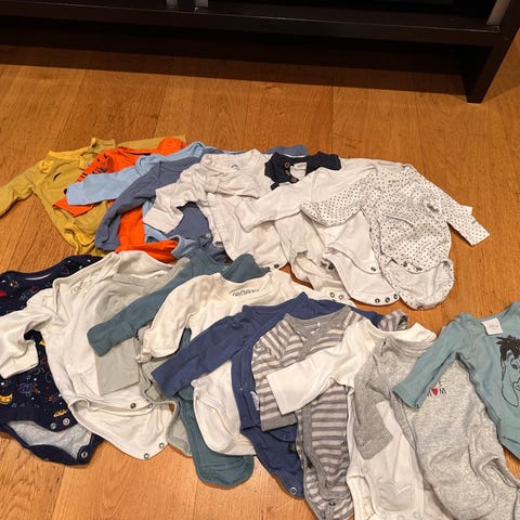 Baby klespakke i størrelse 62-68, flerfarget design, egnet for både gutter og jenter. Inneholder ulike plagg med varierte mønstre og farger.