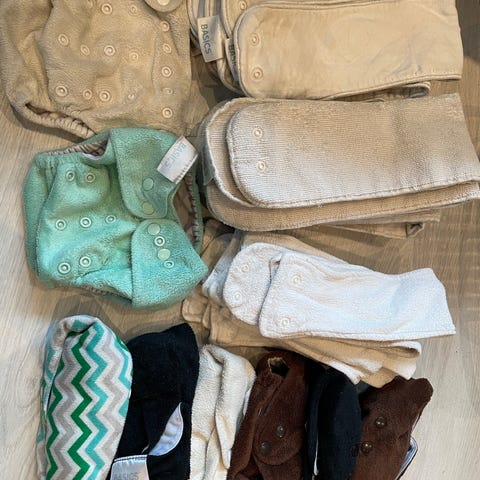 Selger 3 bleier i bomull og veldig mange innlegg til tøybleier. De fleste er i bomull. Noen i hemp/bomull blanding og 3 i ull. Kan få med noen natt bed mats på kjøpet som synes på siste bildet. Den blå og oransje bleien er for baby opptil 6 kg. Den hvite er veldig stor, står ingen størrelse.