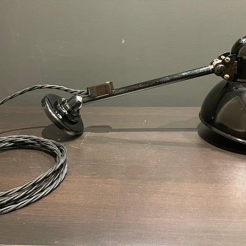 Dette er en snart 100 år gammel designklassiker av en bordlampe designet av Christian Dell for Kaiser Idell i årene 1933/1934. Den er i rustrød original farge. Den er elegant og funksjonell, og med et industrielt utseende. Lampen har patina og er slitt i henhold til alder og med bruksmerker ( se bilder), men fungerer fint teknisk. Det er montert ny bryter da denne ikke fungerte, samt skiftet til ny testilledning nytt jordet støpsel.