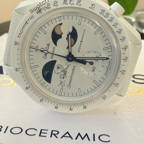 Selger en Omega x Swatch MoonSwatch Mission to EarthPhase fra Bioceramic MoonSwatch-kolleksjonen. En svært ettertraktet modell med unik EarthPhase-indikator og ikonisk Speedmaster-design.