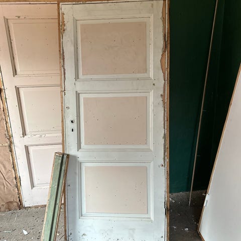 7 Trefyllingsdører Furu med karm, hengsel, messinghåndtak og lås