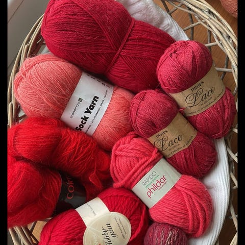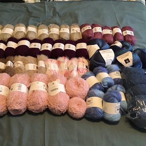 Garnpakke med 200 gram drops alaska farge 03 (grå), 179 gram drops nepal farge 0300, 32 gram drops nepal fargenr ukjent (blå), 50 gram drops merino extra fine farge 08 (beige) og 150 gram drops merino extra fine farge 06 (brun).
