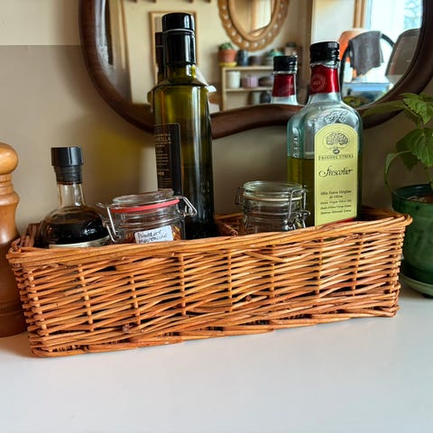 kurv laget av flettet materiale. Kan brukes til oppbevaring eller som dekorativt element i hjemmet.