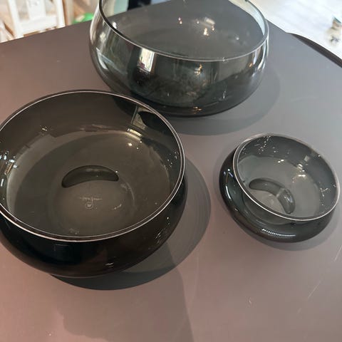 Scandinavia Mid -century, Norway. 2 stk H: 21/22 cm D: 17 cm nederst på klokken. En i grønnskjær og en i gråskjær. 1 stk H 18 cm D: 14 cm med grønnskjær. I fin stand, ingen skår/skader. 600 kr pr stk