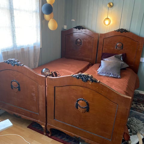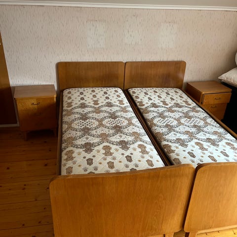 Det er sprekk i treverket på langsiden til den ene sengen. Fineren nederst på bena til den ene sengegavlen er løsnet, se bilde.
