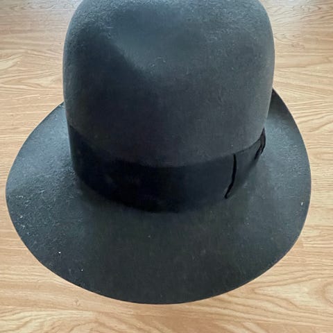 Selv om foret har løsnet er denne hatten i svært god stand. Brukt av kun en person og oppbevart godt senere år. Den er brun, mørk brun. Se bilder for merke og størrelse.