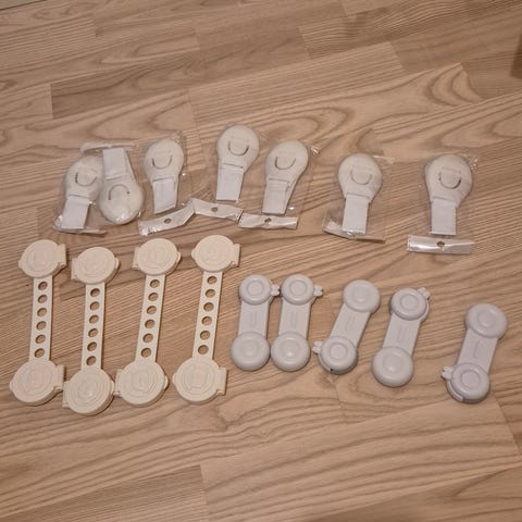 10 stk esker med skap- og skuffesperre (en eske er åpnet)