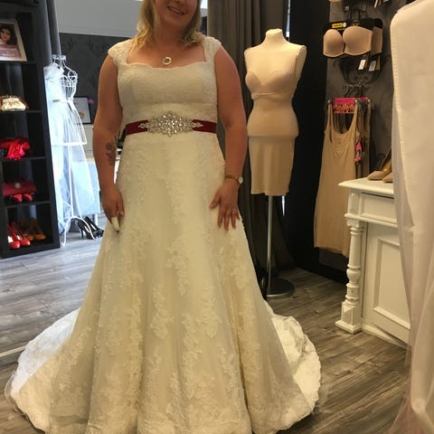 Mermaid fasong, langt slep, perlebroderier på hele kjolen, v-formet rygg