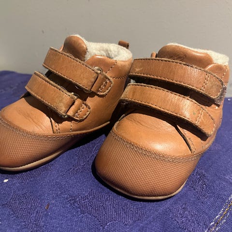 Skoene er en fin mørk rosa/bourdeaux og laget i skinnmateriale. De har borrelås for enkel justering og en myk, varm fôr på innsiden. Egnet for små barn.