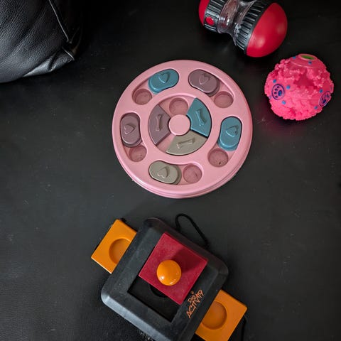 Man legger godbitene oppi og hunden skal dytte på den slik at godbitene faller ut.