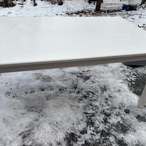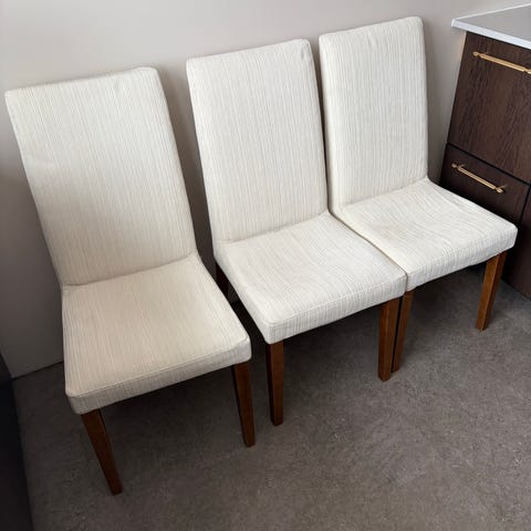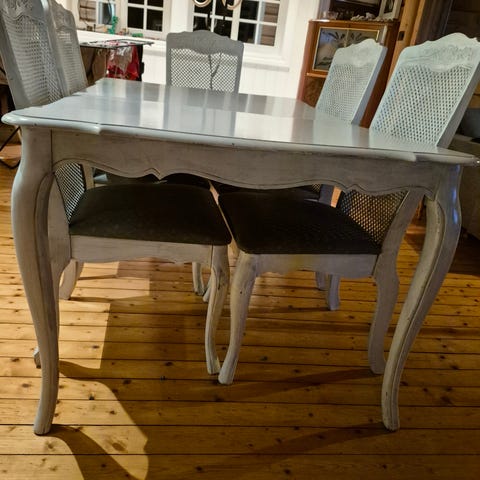 Spisebord og stoler. 10 stoler i imitert skinn. Noen har gått opp i sømmen innserst i stolen, se bilder. Ellers grei tilstand. Gis bort. 4 etg uten heis.