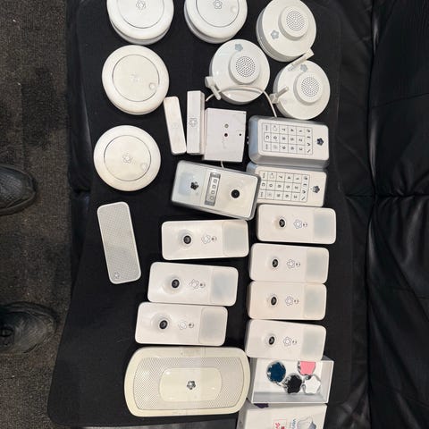 Danalock V3 smartlåssylinder med Bluetooth-tilkobling, og danapad med tastatur, ekstra batterier og monteringsutstyr.