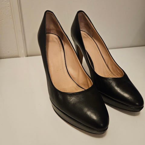 Helt som nye da jeg kanskje har brukt de to ganger inne aldri ute så ingen slitasje på hverken inne eller ytre såle. Svarte skinn med eksklusive stilige detaljer av skinn på hælene