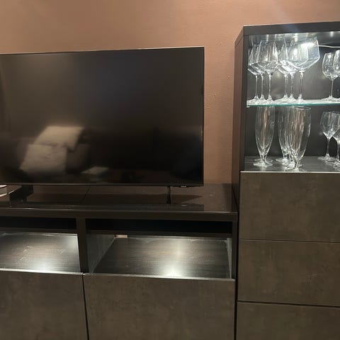 Lang skjenk/TV-benk med flere glassdører og god oppbevaring.