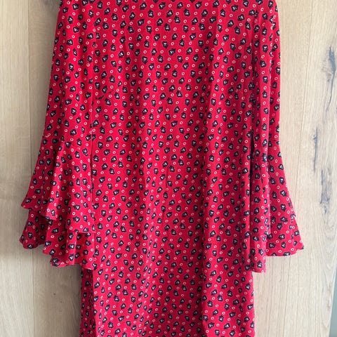 Ganni kjole i størrelse 40 for kvinner. Kjolen er laget av viskose og har en rød farge med svarte prikker. Den har lange ermer med volangdetaljer og en rund hals. Materialet og designet gjør den egnet for ulike anledninger.