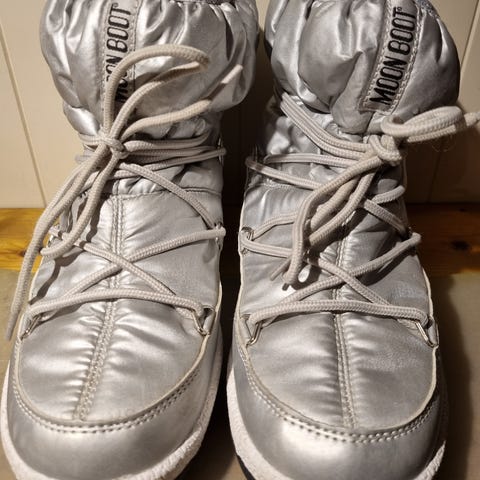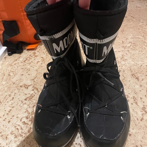 Moon Boot barnesko for jente i størrelse 36. Skoene har en blank svart overflate og snøring foran. Sålen har kraftig mønster for grep.