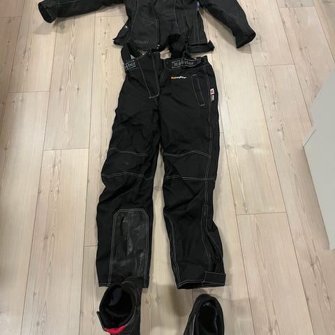 Yoko Motorsports jakke og bukse i rød og svart farge til barn. Jakken har flere lommer, belte med Yoko-logo, og glidelås foran. Bukse med seler