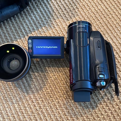 Sony Handycam videokamera med 60x optisk zoom og svart farge. Kameraet har en skjerm som kan vippes ut for enkel visning og kontroll. Passer til opptak av video i ulike situasjoner.