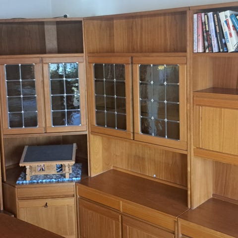 Heltre bokskap, kjøpt Helgø Møbler. Skapet er satt sammen av tre deler + toppen. Hver del er lengden + høyde 72 cm