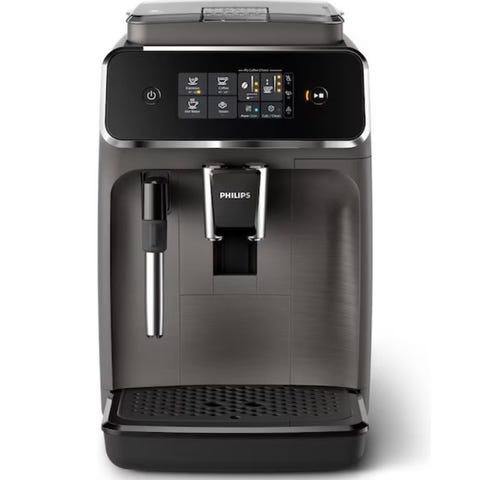 Philips espressomaskin i svart farge. Maskinen har flere funksjoner for kaffebrygging og er designet for hjemmebruk.