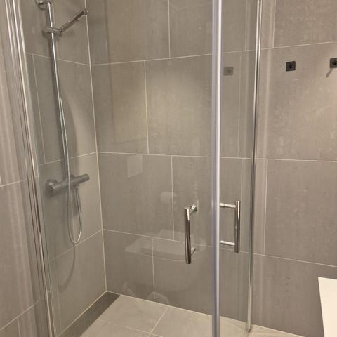 Dusjkabinett med glassdører og dusjarmatur