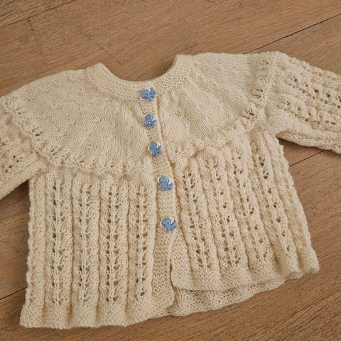Søt hjemmestrikket jakke i ull, med perleknapper. Beige/naturhvit. Knapt brukt.