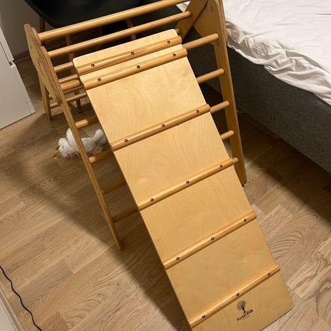 Uåpent 4-i-1 klatresetr for småbarn. Triangelstige + Klatrebue + Rutsjebrett + Pute. Selges da den er for stor for oss. Ligger enda i esken den kom i. Kjøpt for 1799 + frakt.