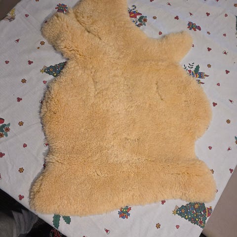Nydelig varmt og mykt saueskinn til vogn. Trenger en vask, ellers svært pent brukt.
