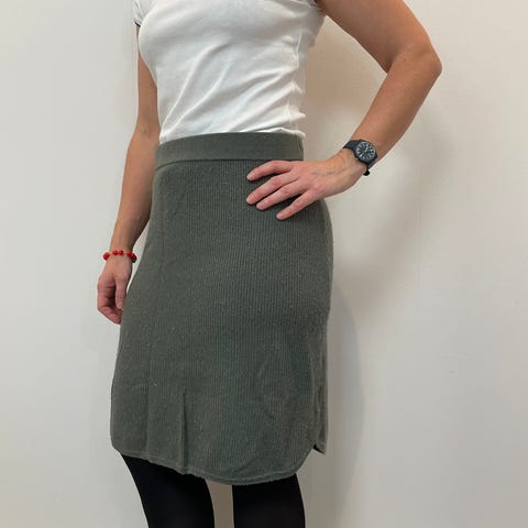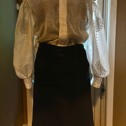 Pent brukt skjørt i imitert skinn selges. Skjørtet har en flatterende, lett A-formet fasong og sitter fint i livet. Det har et klassisk og stilrent uttrykk som gjør det enkelt å kombinere både til hverdags og fest. Materialet gir et skinnlignende preg, samtidig som det er mykt og behagelig å ha på.