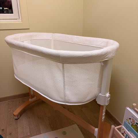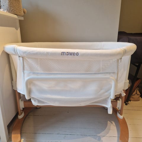 Moweo Bedside crib barneseng med hvitt stoff og treben. Designet for bruk som en seng ved siden av foreldreseng for enkel tilgang til barnet.