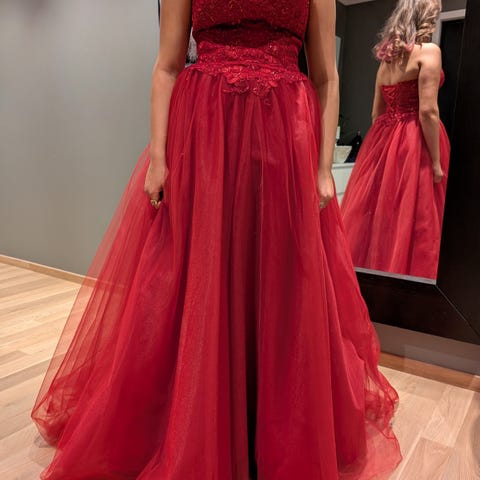 Vakker kjole Mira bell LKW of Norway . Kjøpt på Tina Ritzi i januar 2026 og brukt kun en gang . Den kan bæres som tubetopp kjole, off-shoulder eller bare vanlige stropper. Her får du altså tre måter å bære kjolen på! Korsettet sitter fint og godt på kroppen, slik at kjolen føles lett og behagelig på. Korsettet er justerbart og kan passe str. xxs-s