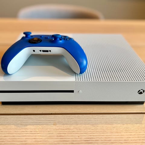 Xbox One s konsoll i hvit farge med matchende hvit kontroller. Konsollen har standard Xbox One s design og funksjonalitet.