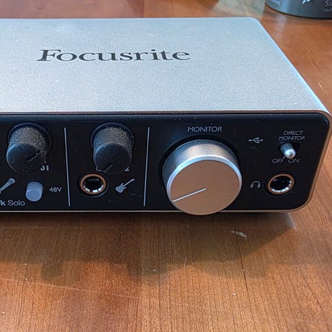 Focusrite Scarlett 2i2 er et USB-lydgrensesnitt i rød farge. Den har to kombinerte XLR- og jack-innganger, justerbare gain-kontroller, og en hodetelefonutgang. Enheten er egnet for opptak og lydproduksjon.
