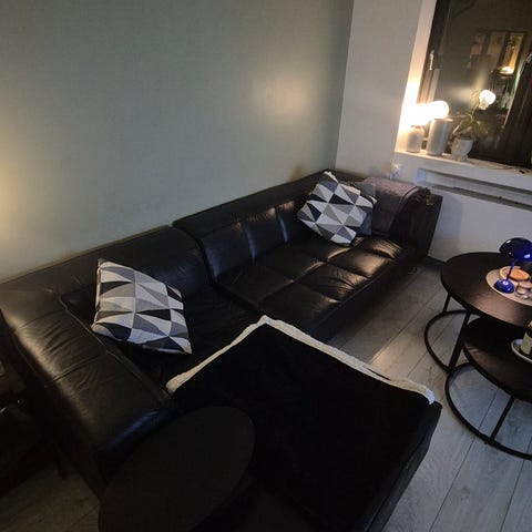 Godt brukt skinnsofa selges. Den har bruksmerker, men er fortsatt god å sitte i.