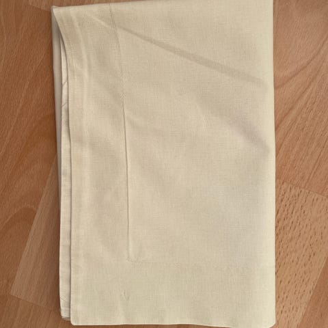 Hvit duk i bomull (140x180 cm). En lys flekk funnet, se bilde. 50 kr.