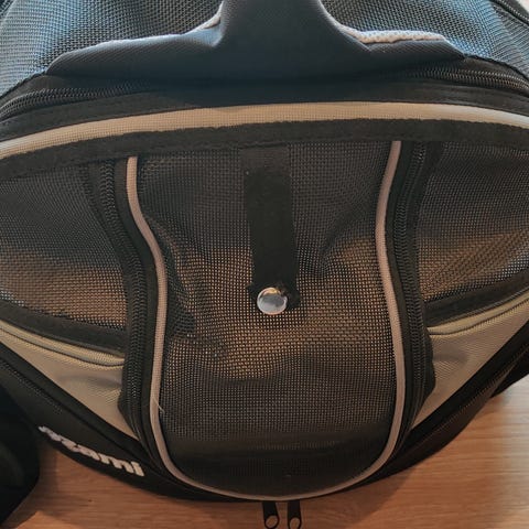 Ozami bæreveske i svart farge med grå detaljer. Vesken har flere glidelåslommer og et romslig hovedrom med mykt fôr. Den har justerbar skulderrem og håndtak for bæring. Egnet til transport av små hunder/katter eller andre kjæledyr. For kan tas av. Kom gjerne med bud. Nypris 1699.-