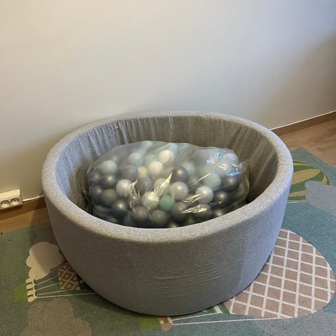 Ballbinge for barn, avtagbart trekk som er nyvasket. Ballet i blå, grønn, hvit og grå følger med.