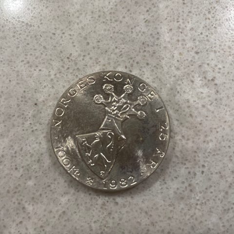 Norges 100-års jubileumsmynt med årstallene 1814-1914. Mynten har Norges riksvåpen på den ene siden og en bygning på den andre siden. Materialet er metall, og mynten er montert på et kvadratisk kartongstykke.